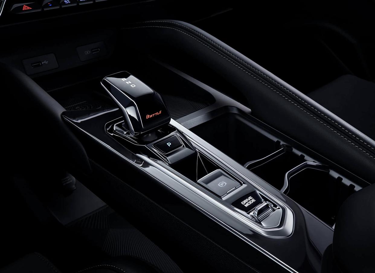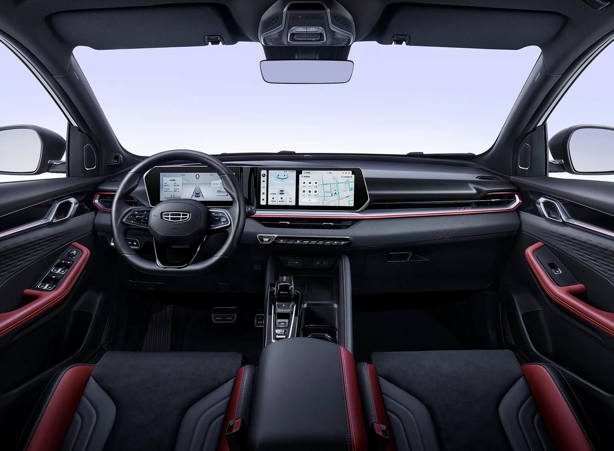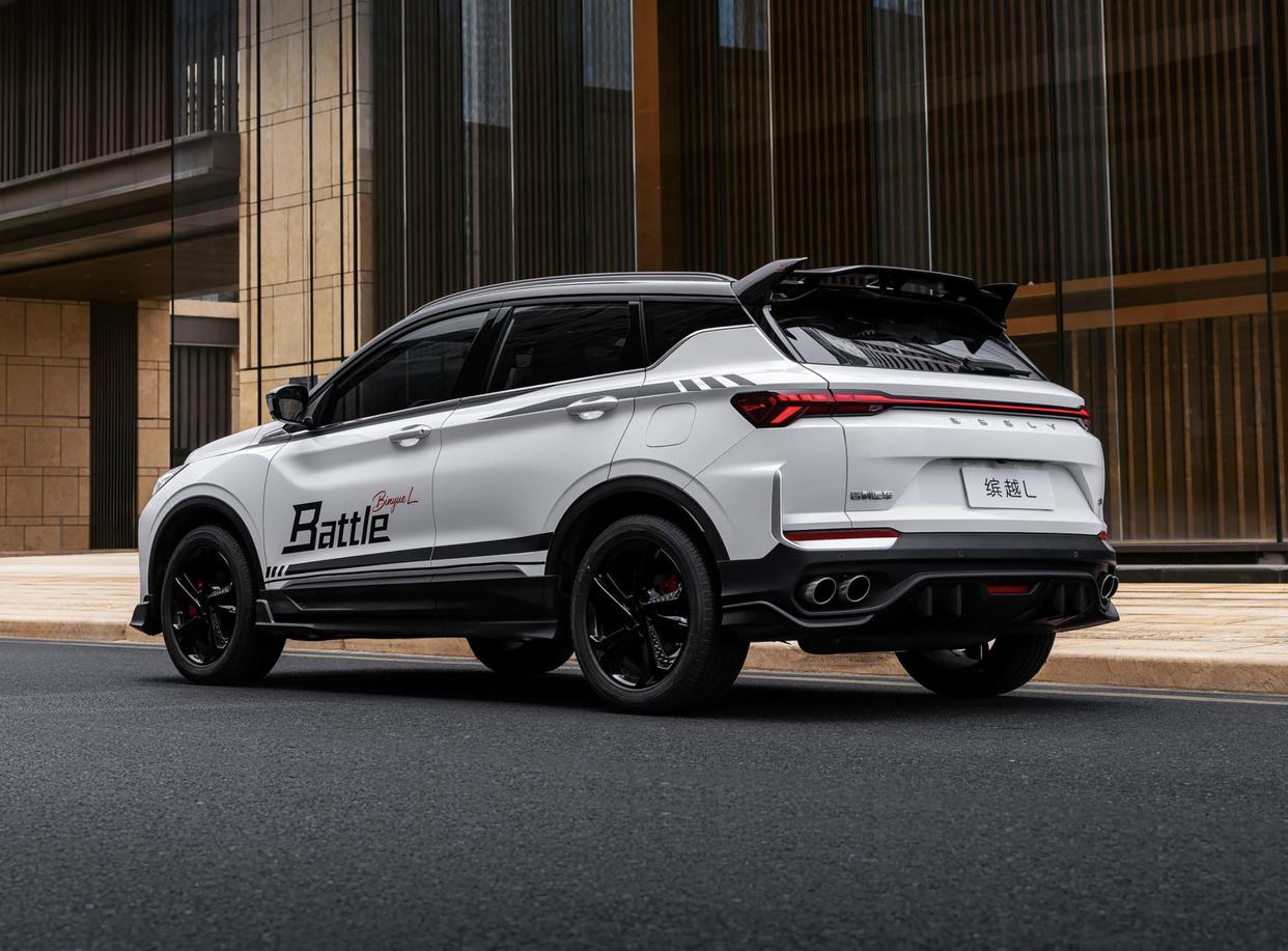 外观设计层面,缤越L Battle版也采用了吉利汽车经典的变化U字形星耀流光进气格栅和点阵式的银色镀铬颗粒中网,并配备了极具辨识度的银质吉利车标,两侧造型犀利的前大灯也加入了黑色的装饰边框,并与格栅的上下边缘巧妙的结合在了一起,拉伸了整车的横向视觉效果。灯组内配备了三条间断式的LED日行灯,内部还融入了LED远近光光源。造型夸张的前包围此压力一体式结构,搭配着黑色的中网,两侧硕大的钩型镀铬金属饰条,再加上底部黑色碳纤维前铲,提升了整车的侵略性。车尾配备了黑色的双峰样式的赛车尾翼,星耀贯穿LED尾灯进行了熏黑处理,再搭配着黑色的底部扩散器和双边四出的排气,不仅层次感丰富,进一步提升运动气息。