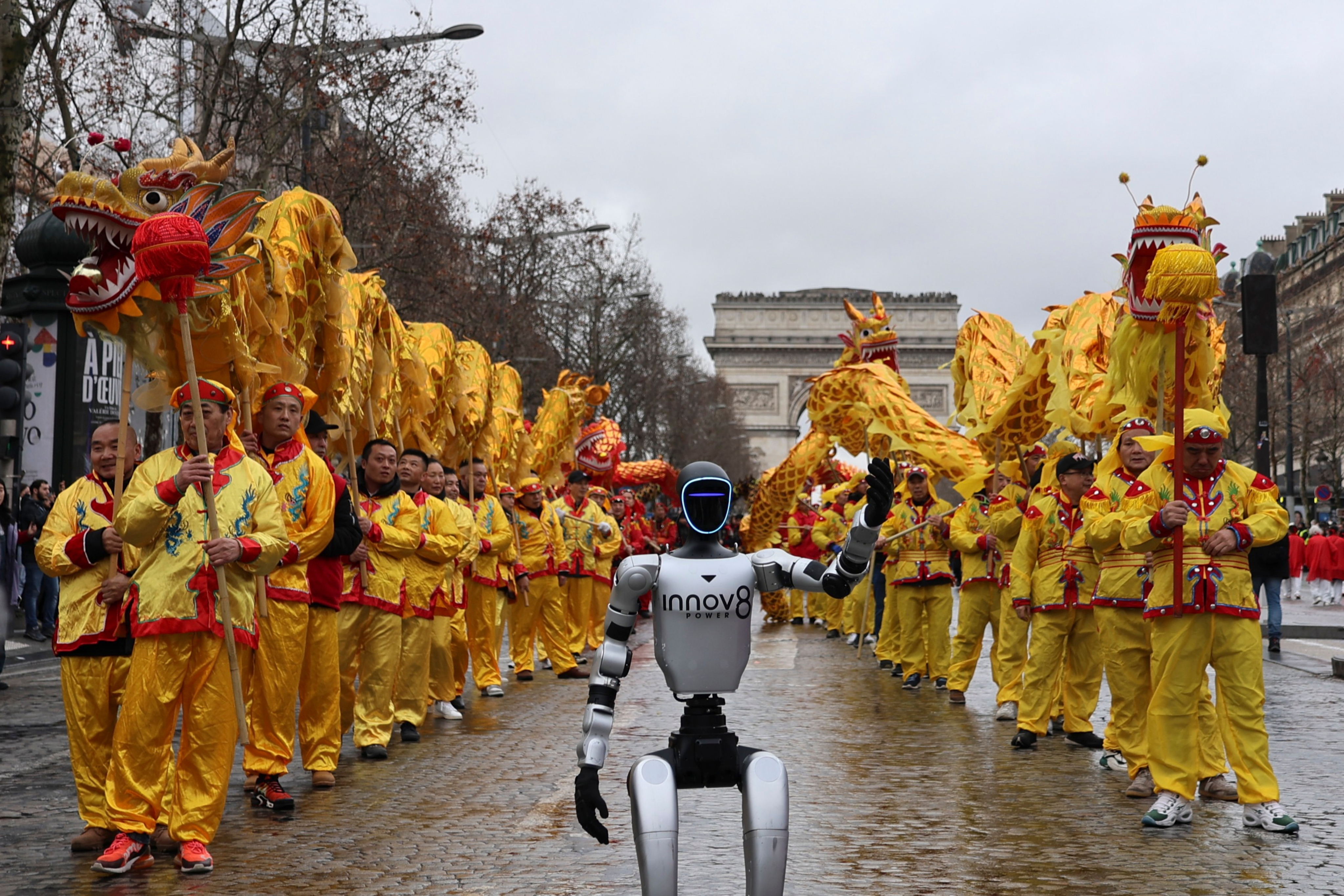 在巴黎香榭丽舍大街,由宇树科技及其法国代理INNOV8集团带来的机器人表演,在“欢乐春节满巴黎·龙狮贺岁舞香街”巡游中“打头阵”,与舞龙舞狮等中国传统文化符号同场亮相。INNOV8集团首席执行官斯特凡纳·博博说,在春节庆祝活动中展示来自中国的创新技术,对于自己来说“机会难得”,也向世界表明春节“既是充满悠久历史的传统节日,也面向未来”。