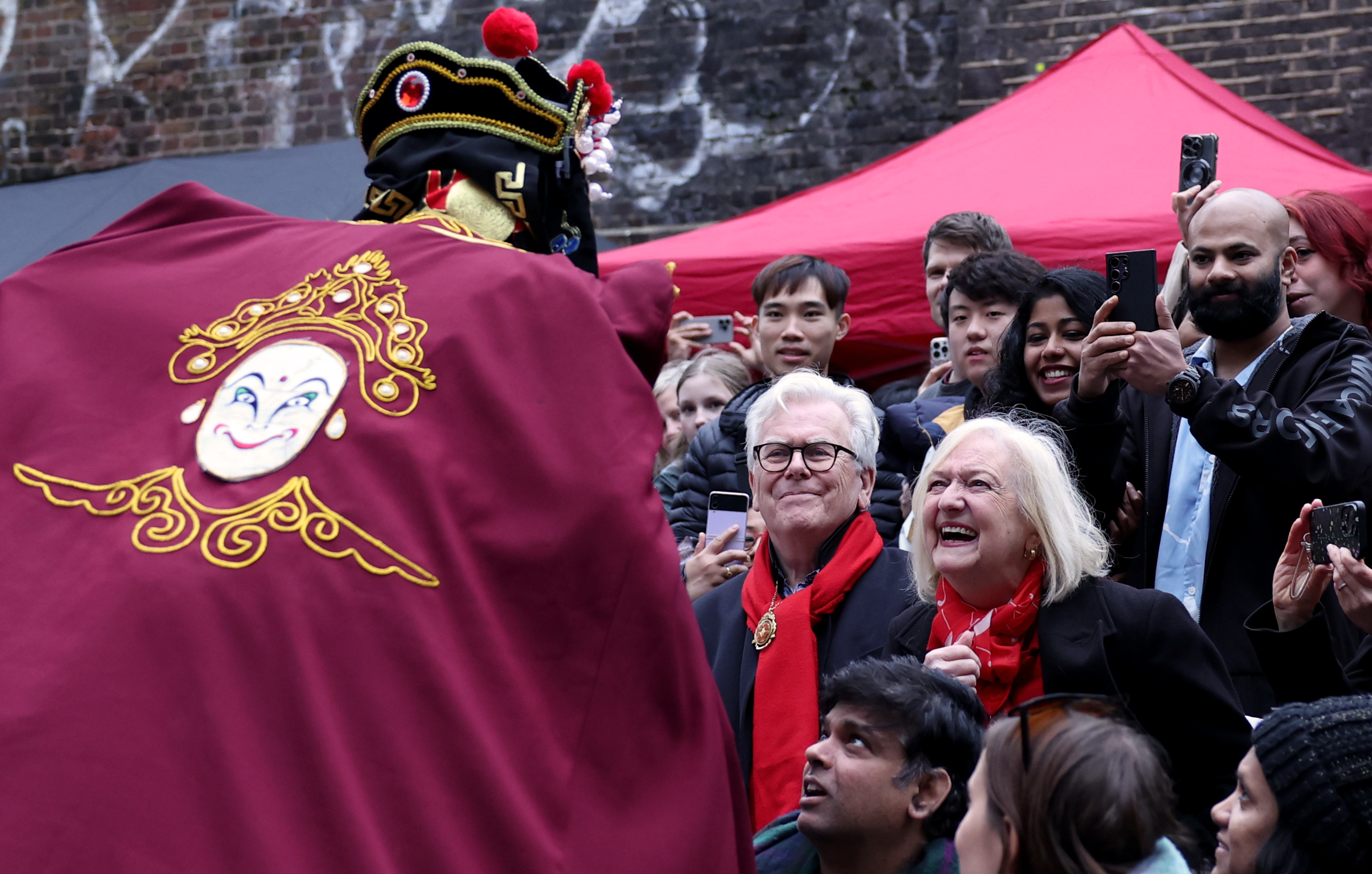 2月21日,川剧演员在英国伦敦卡姆登集市举行的中国春节庆典活动上与观众互动。新华社记者李颖摄